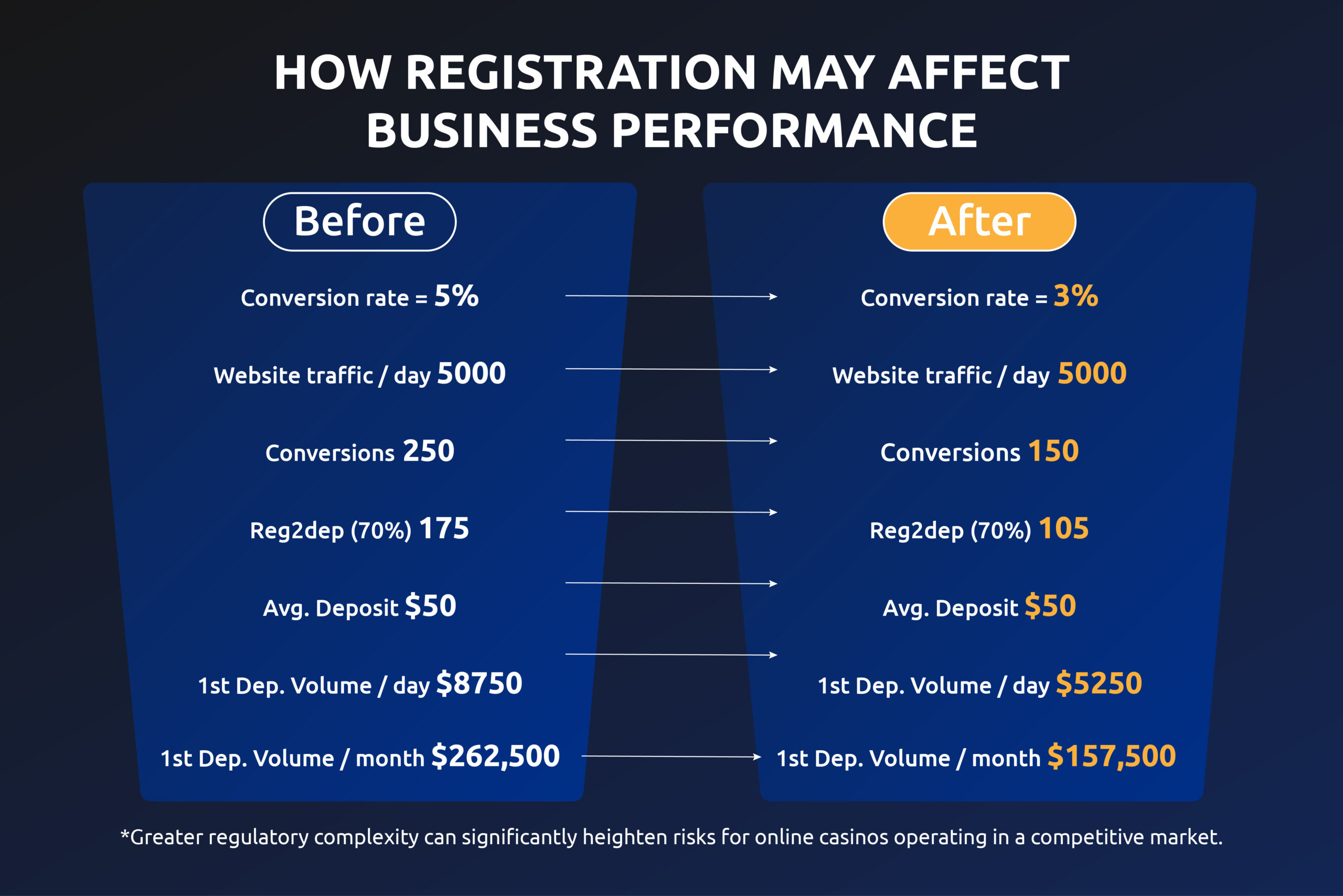 About user experience: The click-to-registration ratio (Click2Reg conversion rate) is a critical metric for a thriving casino platform in the competitive gaming industry. When potential players face an overload of requirements, full address verification, ID documents, and even proof of funds, many simply click away, resulting in fewer completed signups and ultimately lower gross gaming revenue.